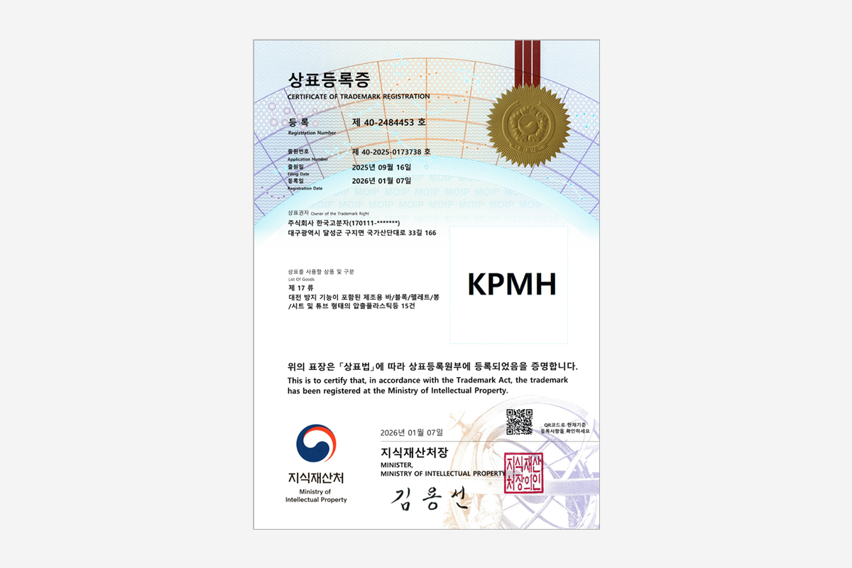 Korea Polymer Co.,Ltd. holds ISO quality certification, Inobize enterprise certificate, Venture company, Global strong company, Export promising company, 2 domestic patent registration and 1 trademark registration, and has currently applied for 4 domestic patent applications and overseas trademark applications.